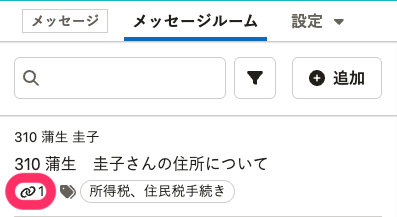 他機能と連携済みのメッセージルームには、リンクアイコンが表示されます。数字は連携しているデータ数です。
