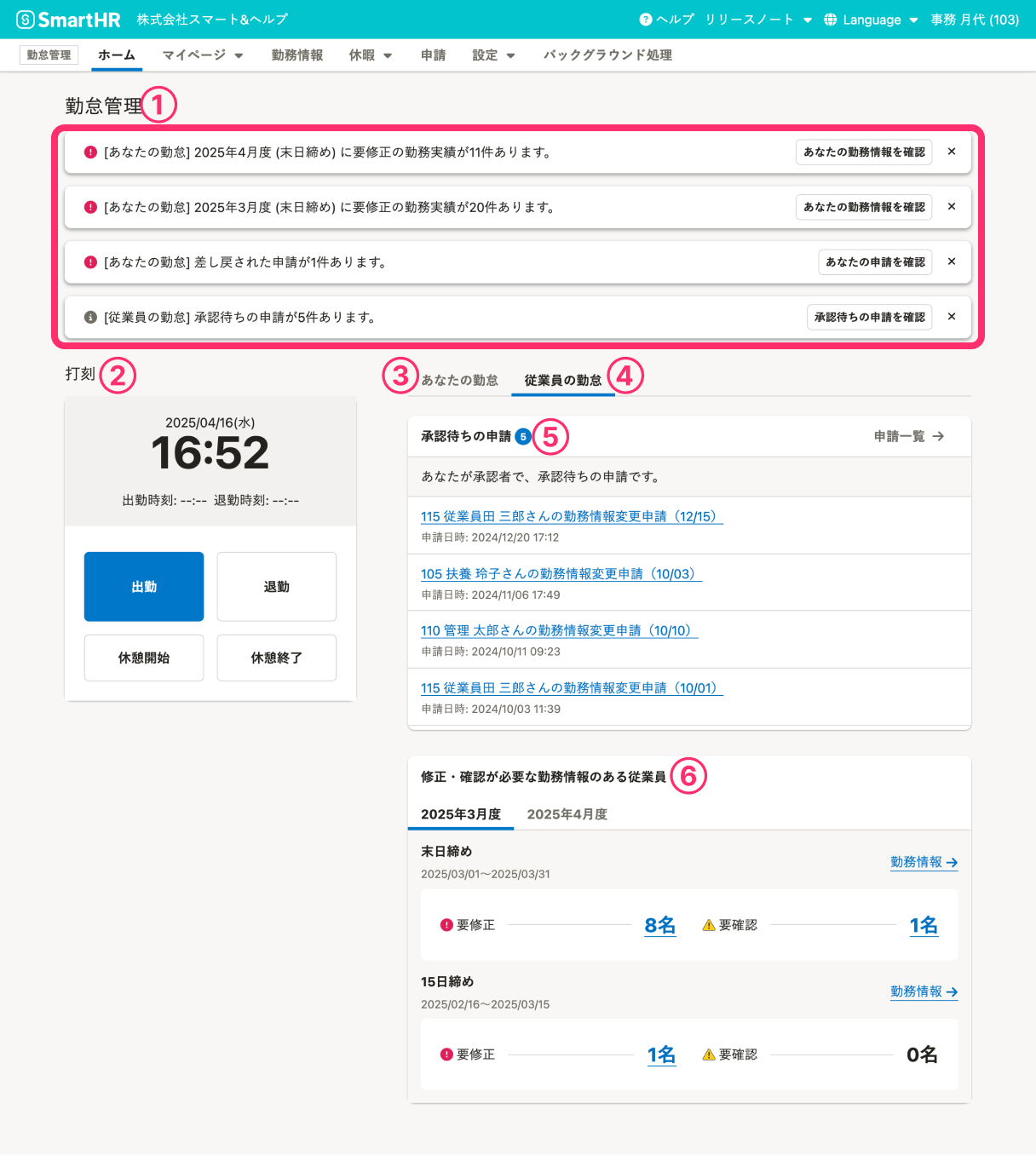 管理者または上長のホーム画面では、自分の勤怠に関する情報と、管理者または上長として確認が必要な情報がまとめて表示されます。