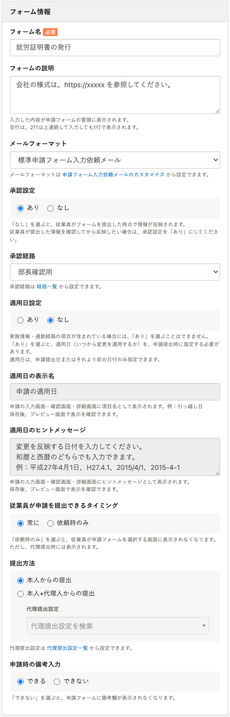 申請フォームの作成画面で、[フォーム情報]、[就労証明書の発行]の設定をして、[作成]を押します。 詳しくは、申請フォームを管理するを参照してください。