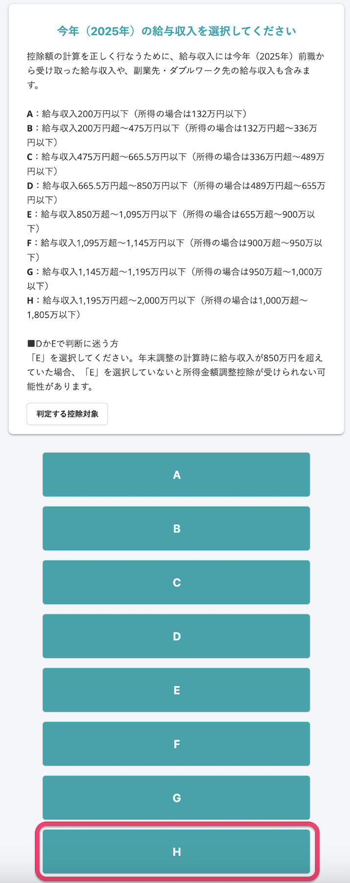 「今年の給与収入を選択してください」で「H」を選択する