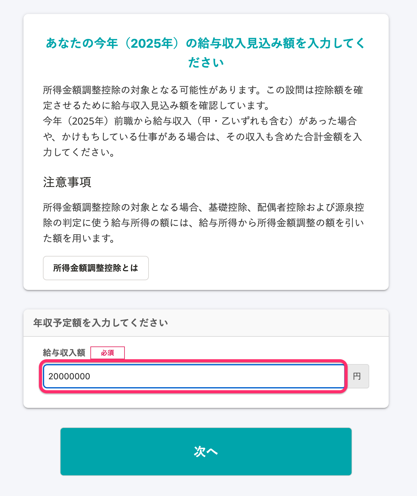 今年の給与収入が2,000万円を超える場合は、[給与収入額]欄に「20000000」(2,000万円)と入力して[次へ]を押してください。
