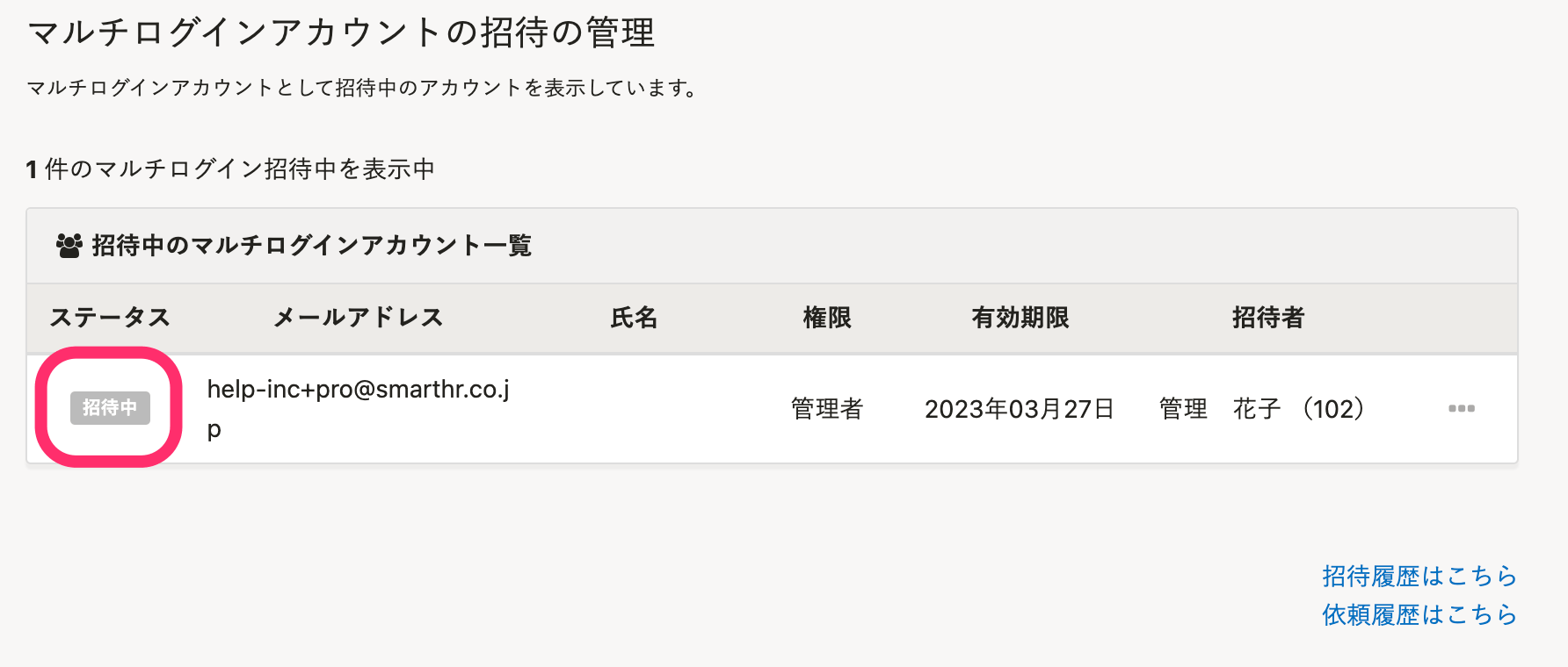 [このページに表示されていないメールアドレス(マルチログインアカウント)への招待中の確認はこちら]を押すと、マルチログインアカウントの招待の管理画面が表示されます。