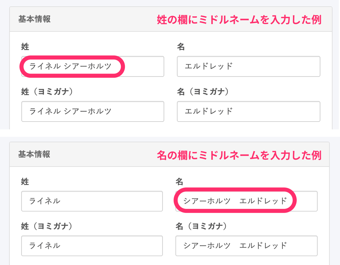 ミドルネームをお持ちの場合、身分証明書などに合わせて姓・名の欄どちらかにミドルネームを入力してください。