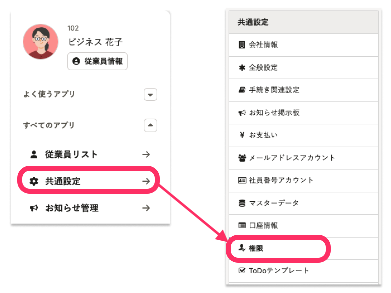自分の従業員情報を変更する申請の提出には、特に権限設定は必要ありません。 ただし、下記のような自分以外の従業員の申請にかかわる操作には権限が必要です。