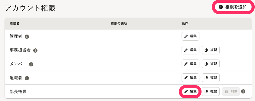 たとえば、部長のAさんとBさんには申請の承認を許可したいといったケースの場合、「部長」というカスタム権限を作成し、従業員情報申請機能で許可する操作を設定します。 「申請の提出依頼から承認まで」「代理提出のみ」「閲覧のみ」など、どの従業員にどの操作を許可するかに応じて、必要なカスタム権限を追加してください。