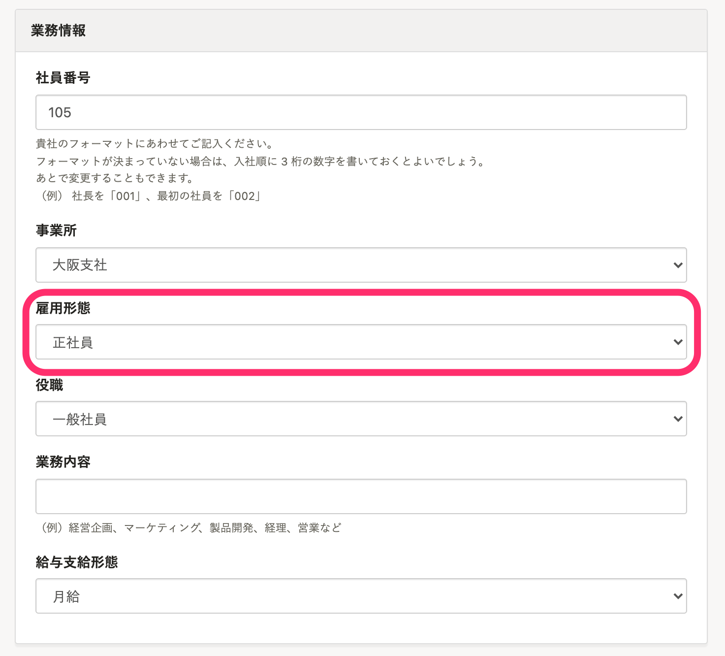 従業員情報画面にある[編集]を押し、[業務情報]>[雇用形態]を設定してください。