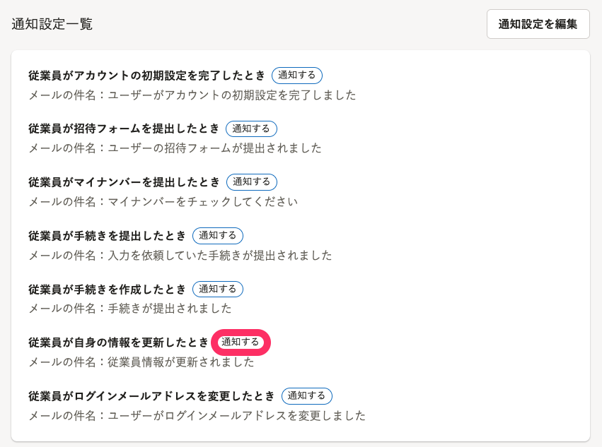 [従業員が自身の情報を更新したとき]の設定が[通知する]になっている場合は、新たな設定は不要です。