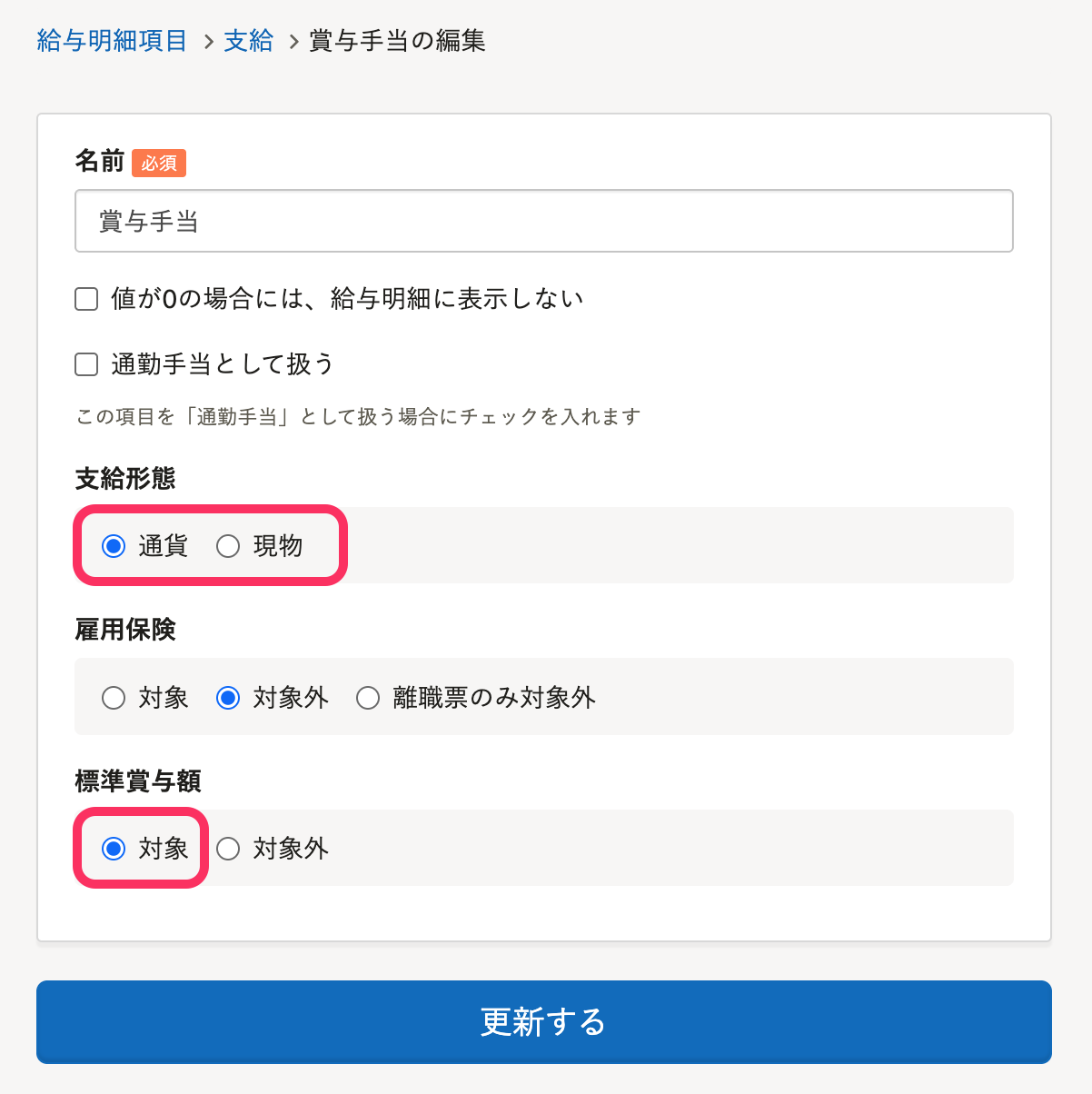 5. [支給形態]と[標準賞与額]で必要な項目を選択し、[更新する]を押す