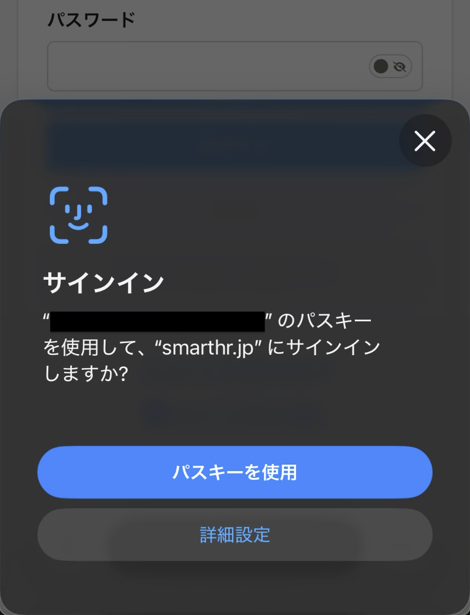 SmartHRのログイン画面で[パスキーでログイン]を押します。