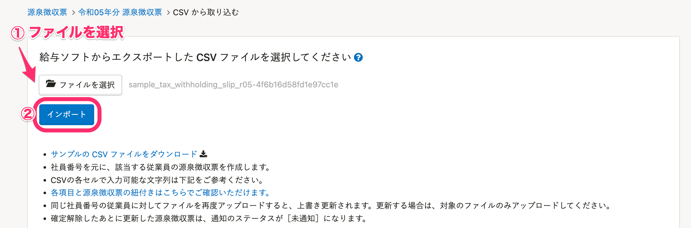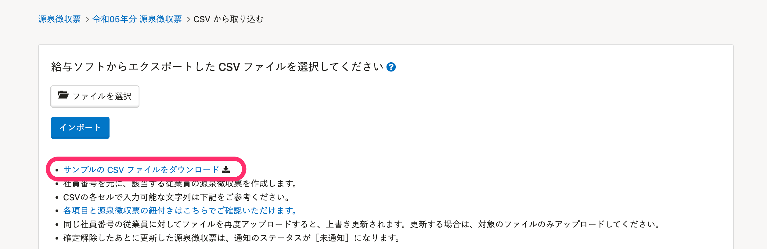 源泉徴収票一覧画面の右上にある[源泉徴収票を追加・更新]>[CSVから取り込む]を押すと、CSVファイルの取り込み画面が表示されます。