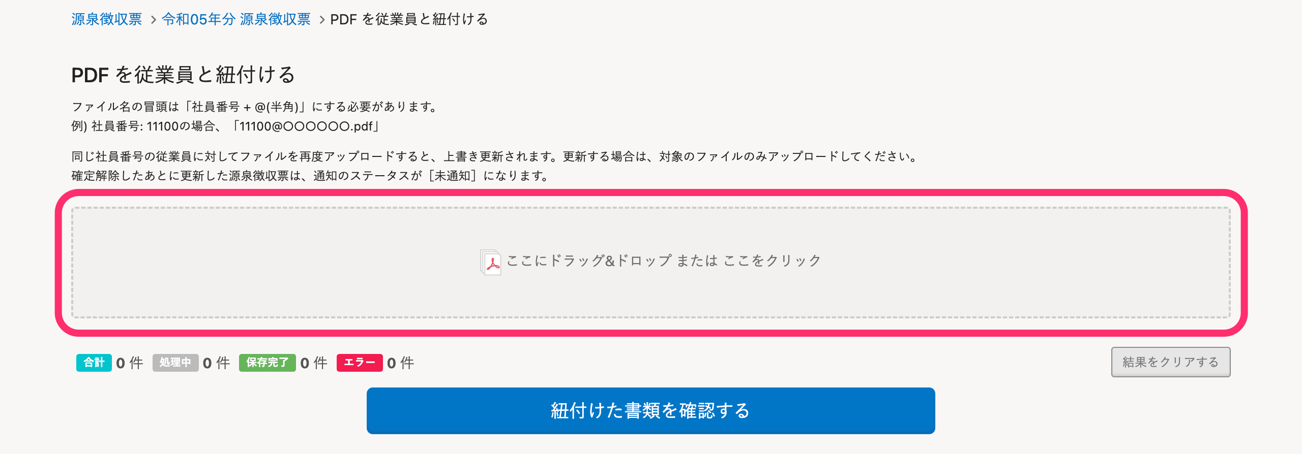 例えば、社員番号001の従業員の源泉徴収票は、「001@令和5年分源泉徴収票.pdf」のようなファイル名にしてください。 ファイル名が上記に沿っていない場合や、ファイル形式がpdfでない場合はエラーになり、アップロードできません。