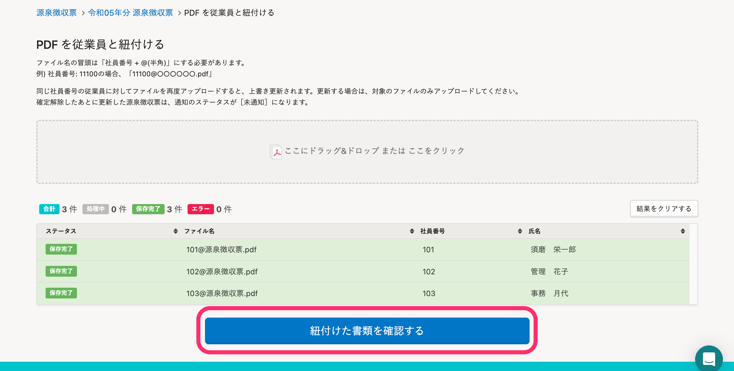 ファイル名は「社員番号@任意の文字列.pdf」のように、社員番号を含めてください。 社員番号が一致する従業員とPDFファイルが紐づけられます。