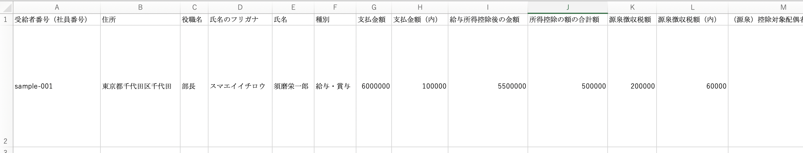 CSVファイルは、以下のように1行目を項目名とし、2行目以降に各従業員の源泉徴収票情報を入力します。