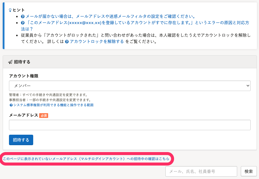 2. [このページに表示されていないメールアドレス(マルチログインアカウント)への招待中の確認はこちら]を押す