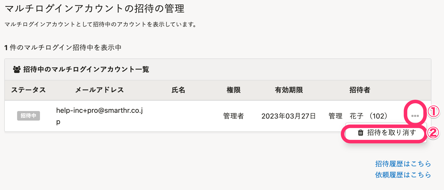 マルチログインアカウントの招待を取り消す手順を説明します。