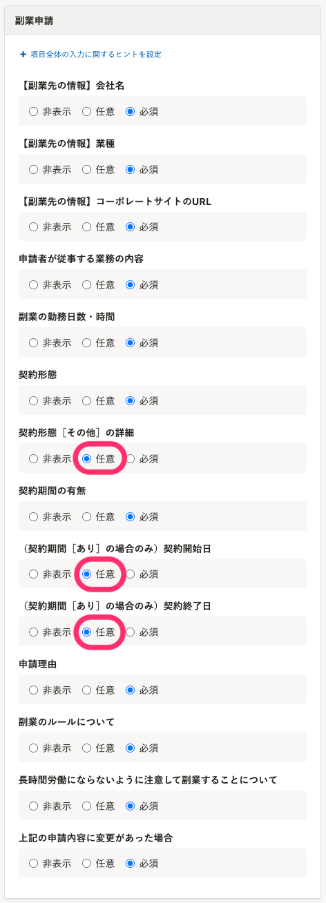 その他の項目は、貴社の就業規則・運用方針に沿って、「必須」または「任意」を指定してください。