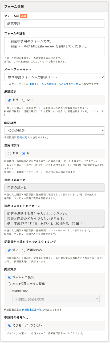申請フォームの作成画面で、[フォーム情報]、[副業申請]の設定をして、[作成]を押します。 詳しくは、申請フォームを管理するを参照してください。