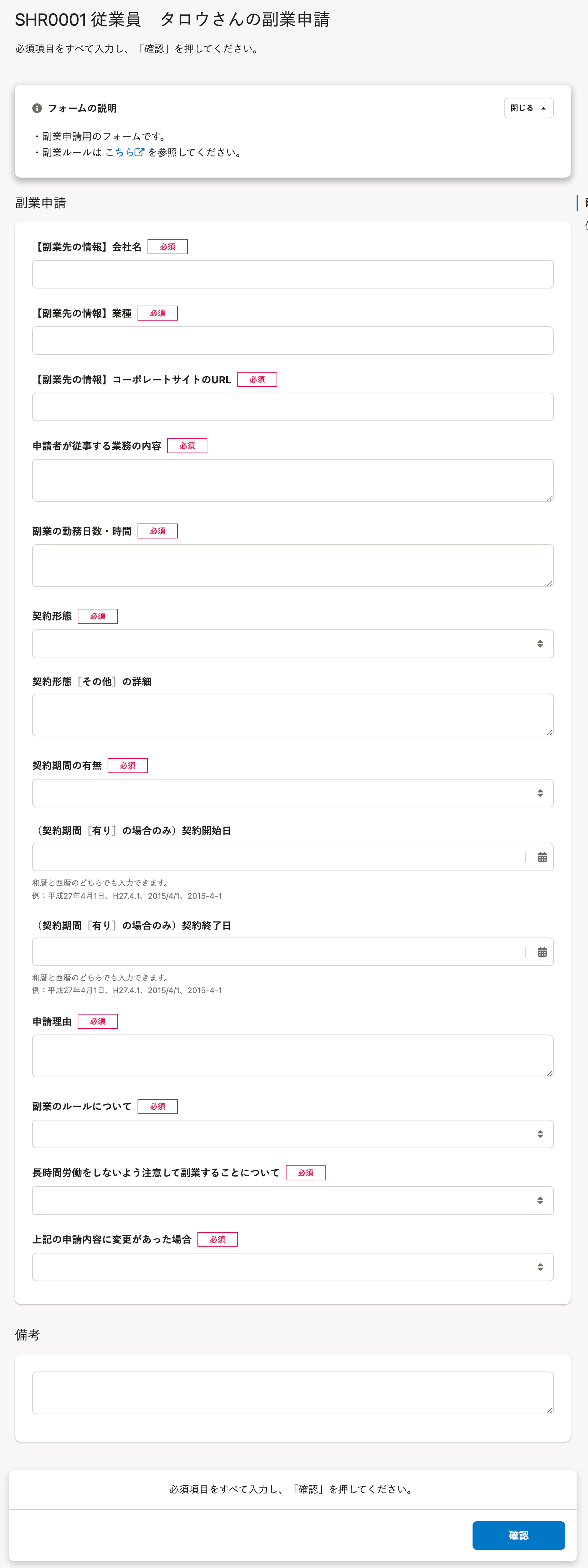申請者が従事する業務の内容、副業の勤務日数・時間などを収集する申請フォームを作成できます。