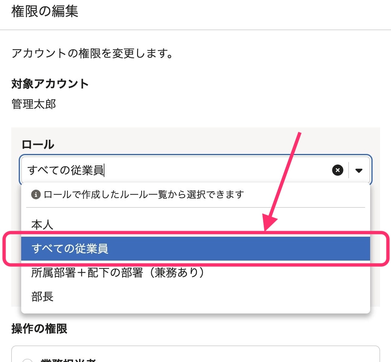 スキル管理機能の権限設定で[ロール]が、上から2番目の「すべての従業員」に設定されているアカウントに送信されます。