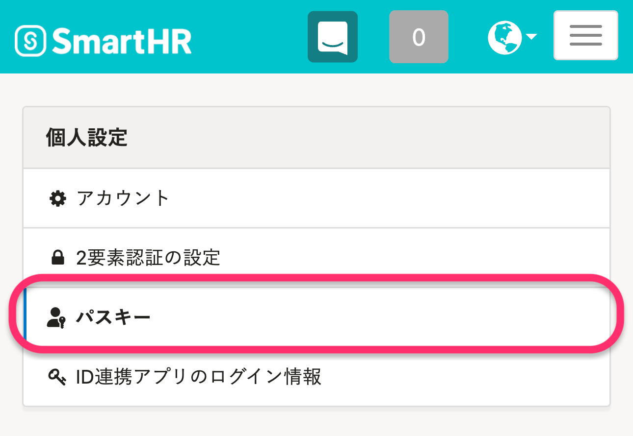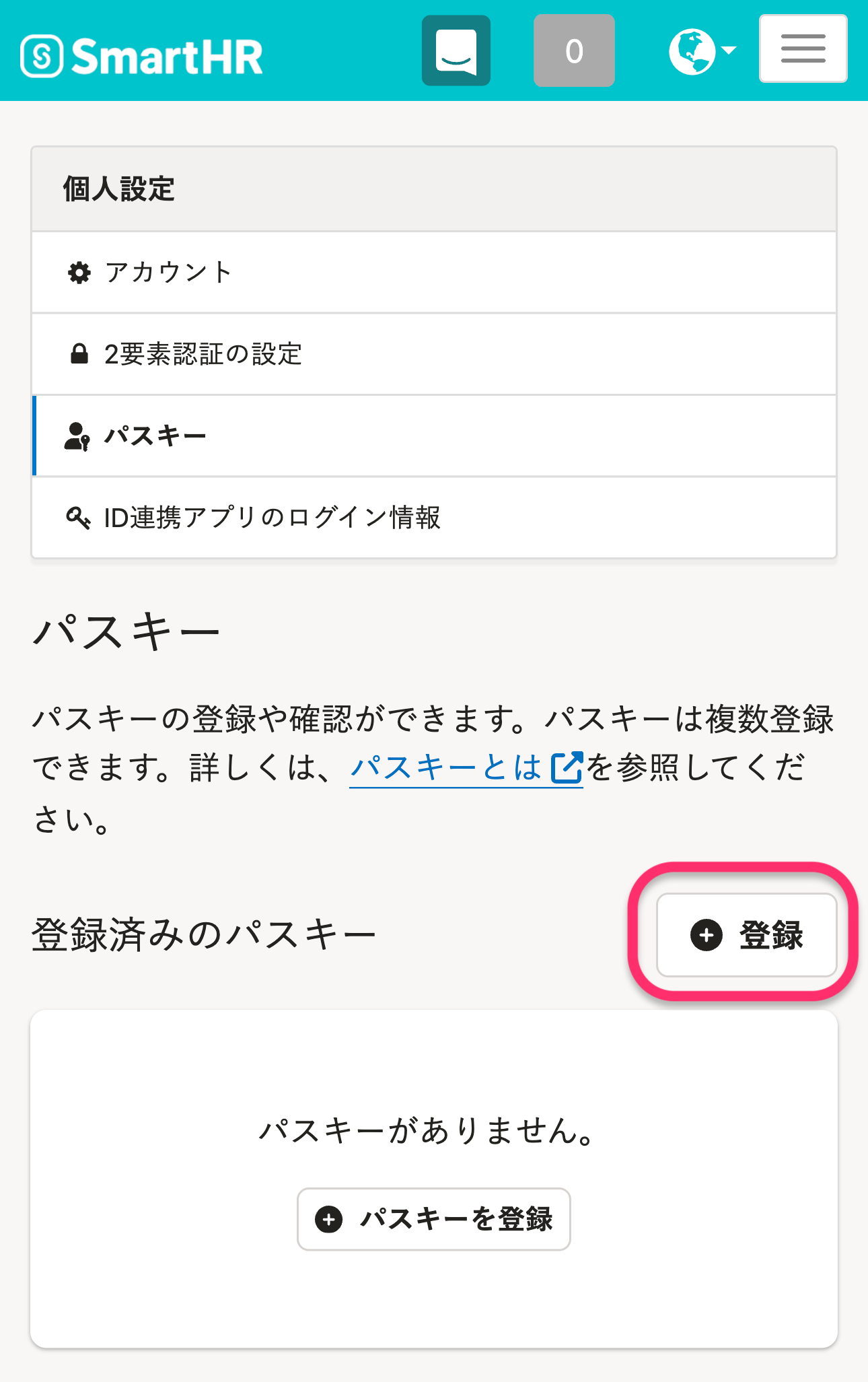 SmartHRにログインする際、パスキーを利用するには、個人設定からパスキーを登録します。