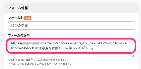 コピーしたURLを[フォームの説明]や[ヒントメッセージ]に貼ると、申請フォームから参照できるようになります。