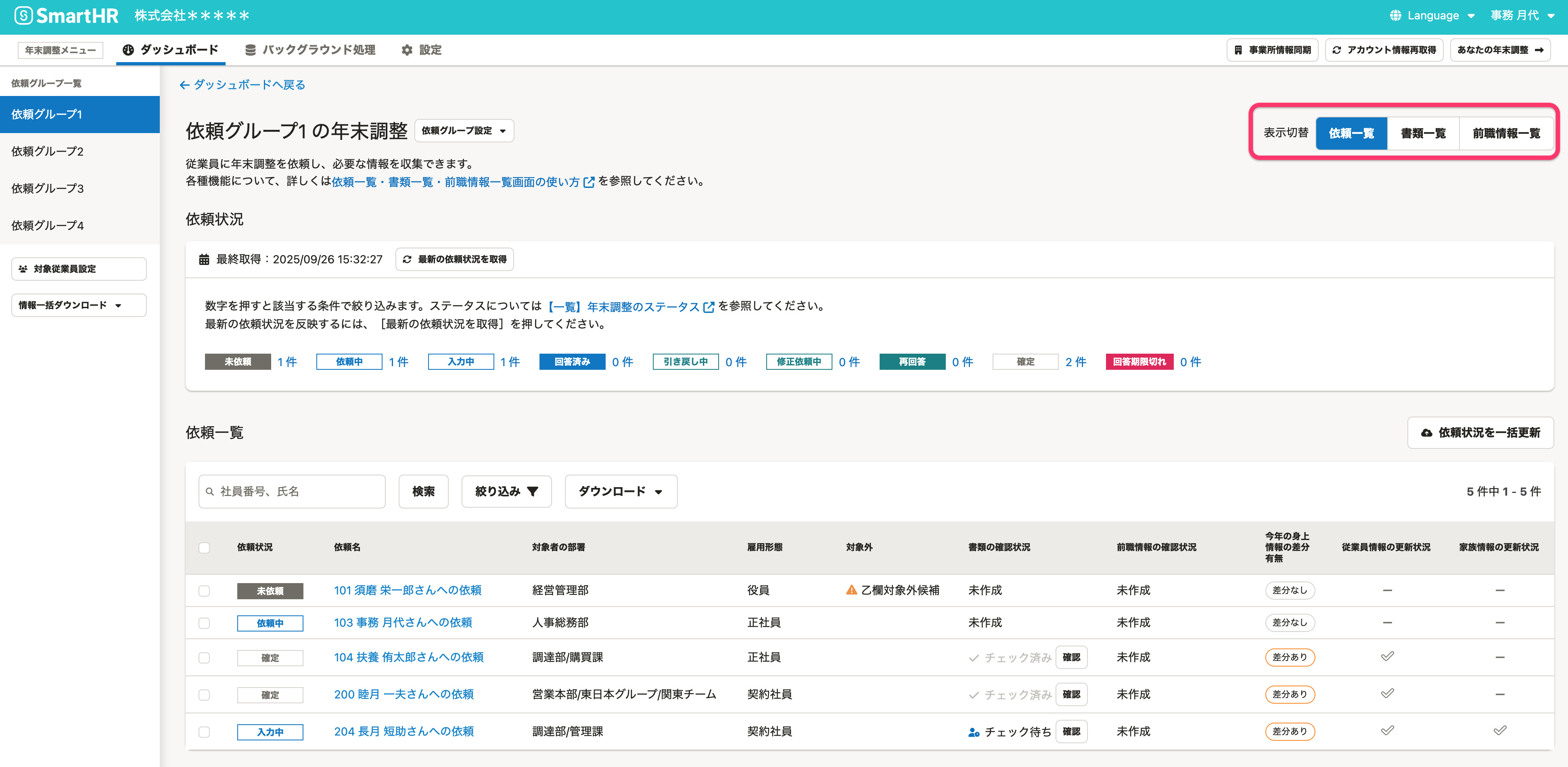 依頼一覧・書類一覧・前職情報一覧画面(依頼一覧画面)は、従業員への年末調整の依頼から進捗の把握・管理、確定までを一覧で表示する画面です。