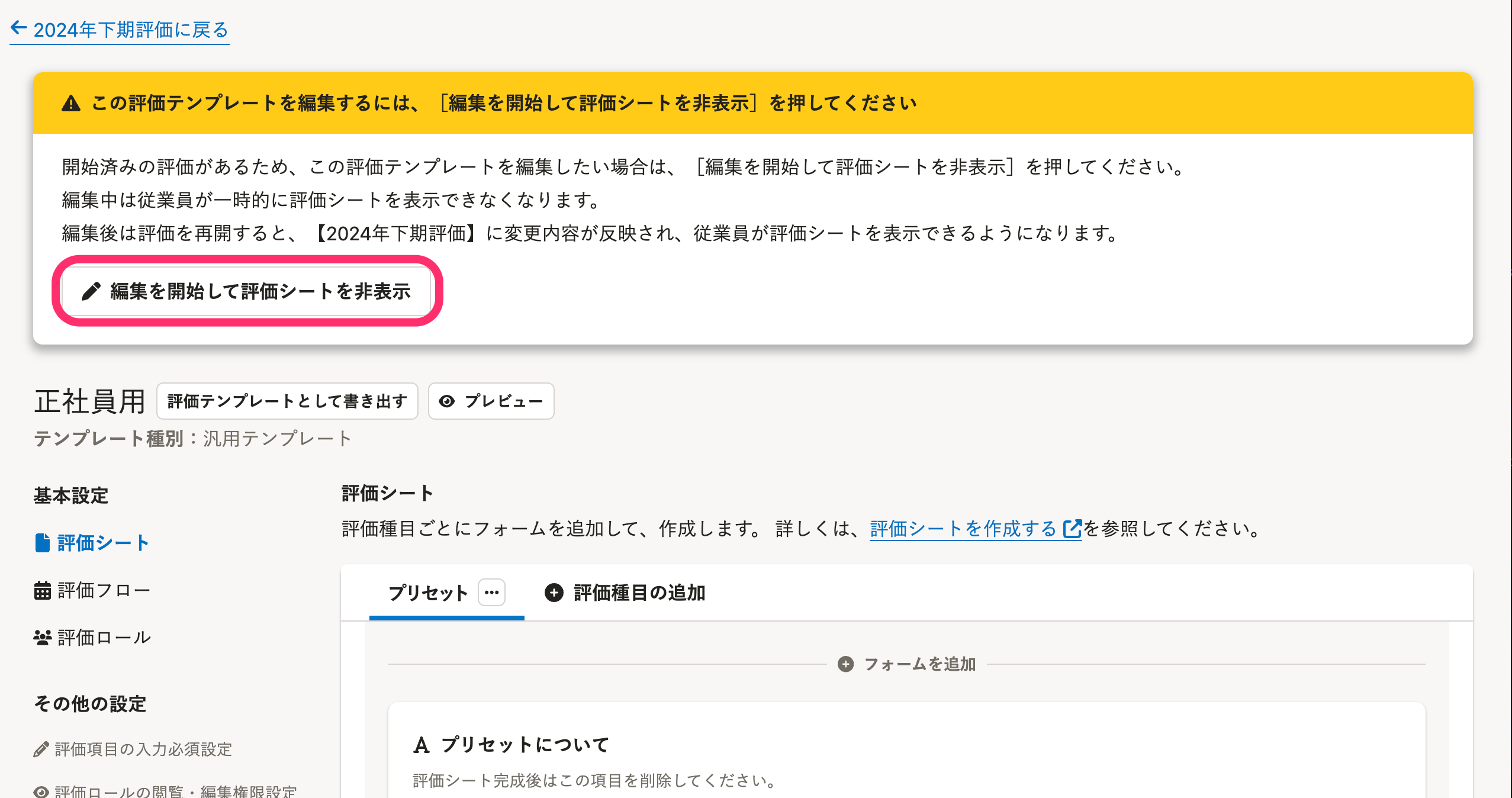 [編集を開始して評価シートを非表示]を押すと、評価テンプレートを編集できるようになります。編集中は従業員が一時的に評価シートを表示できなくなります。