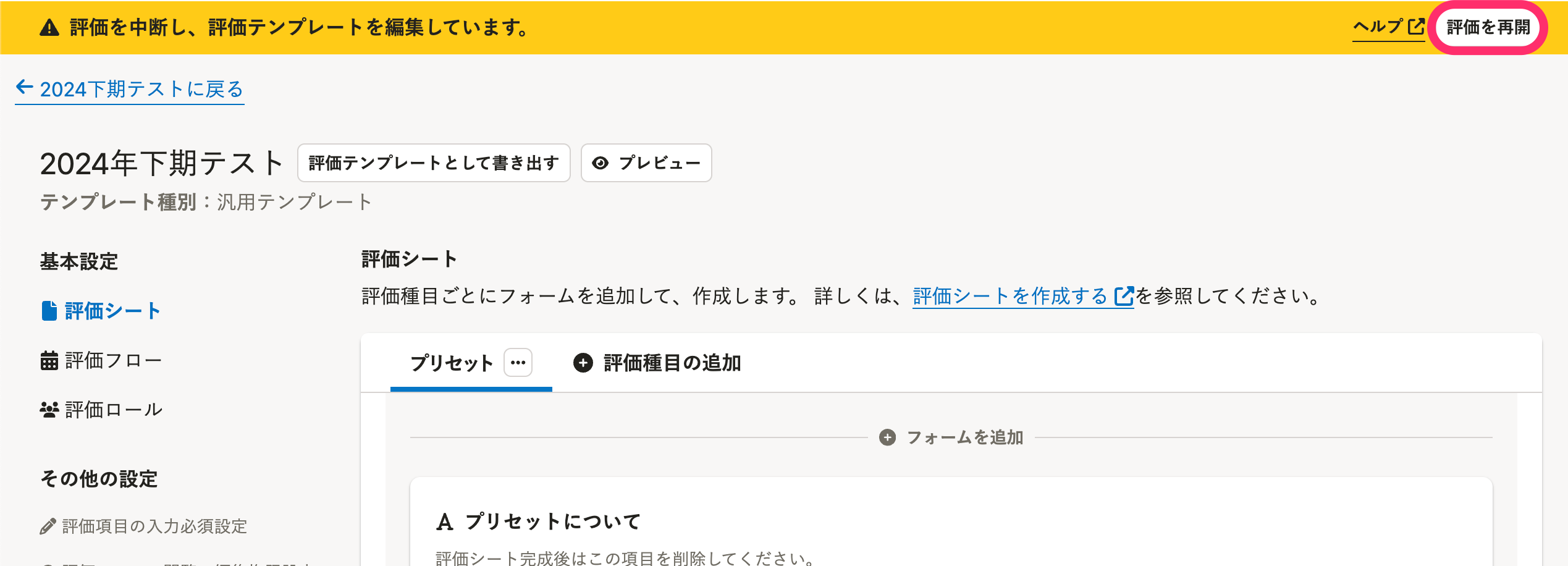 編集中は、画面上部に[評価を中断し、評価テンプレートを編集しています。]と表示されます。