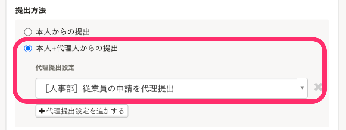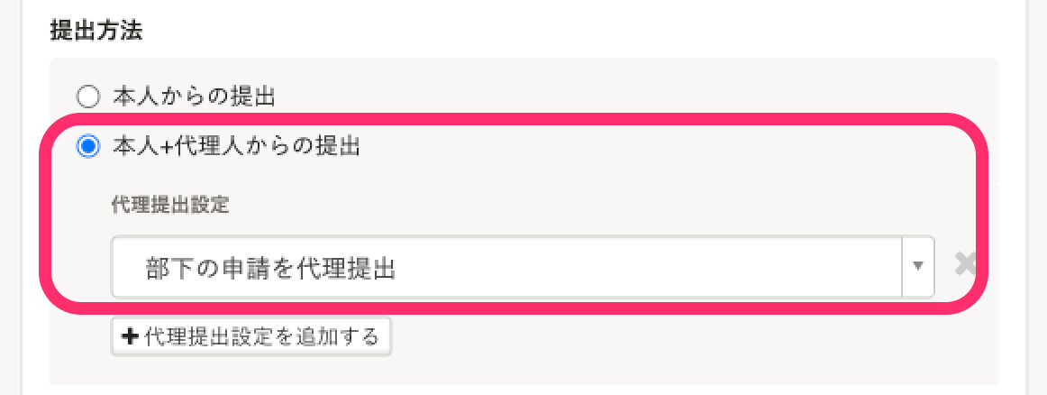 | 代理提出者の指定方法 | [部署で指定]を選択し、代理提出者の部署を指定 |