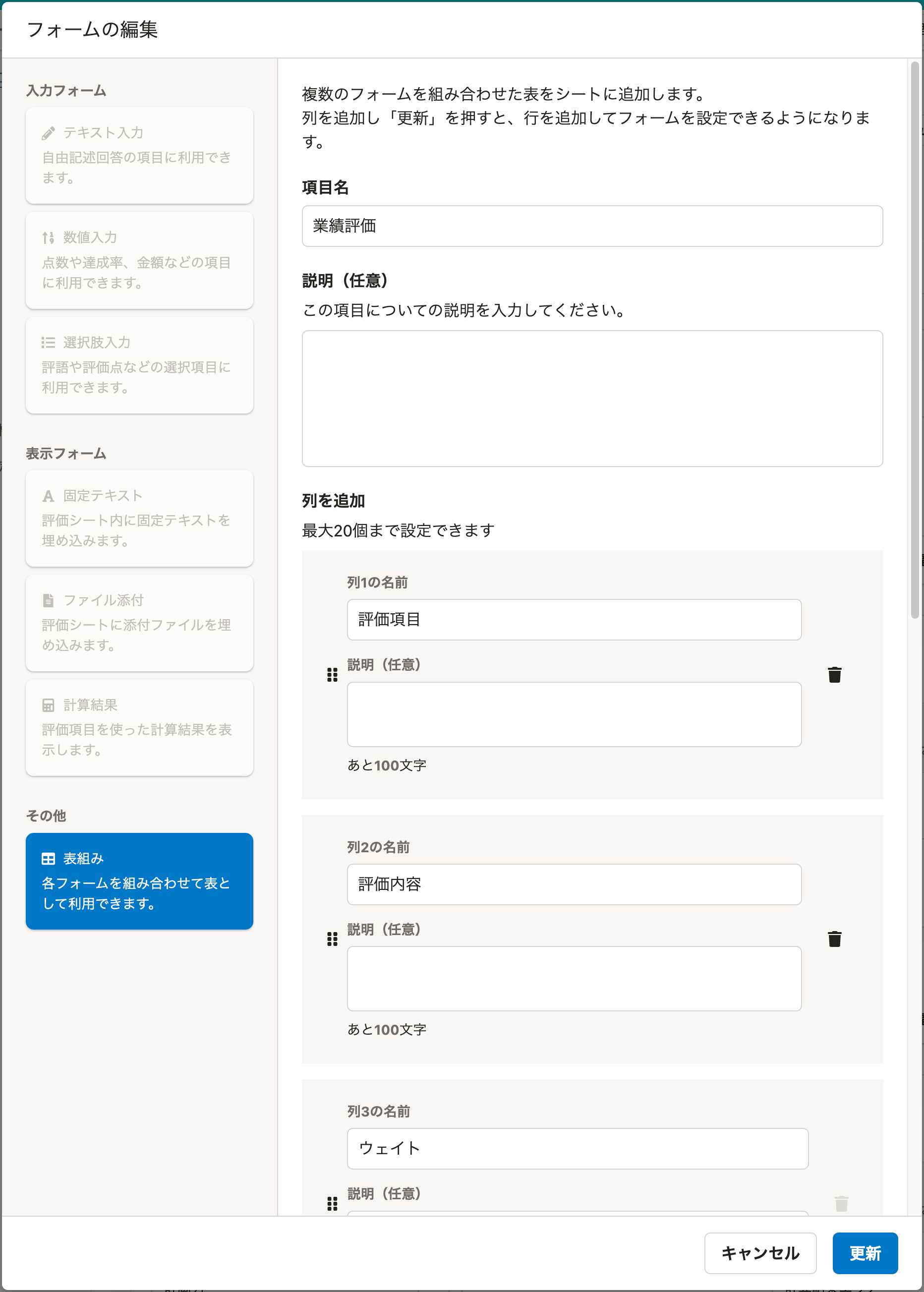 表組みフォームでは、最初に[列を追加]します。サンプルでは、評価項目/評価内容/ウェイト/自己評価/1次評価/最終評価/評点の7個の列を作成しています。