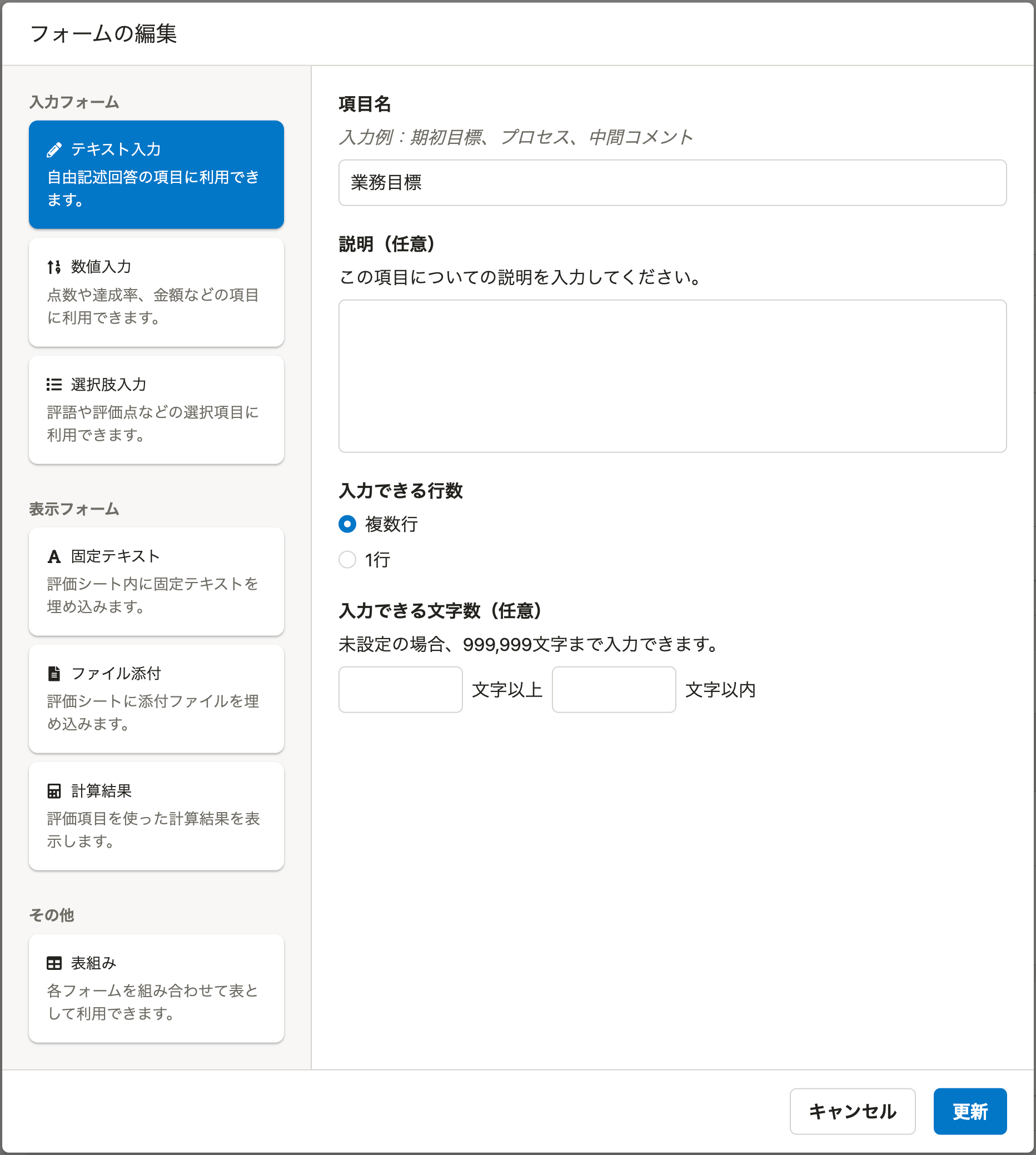 以下では、表組みフォーム内の各評価項目と、使用フォームについて説明します。