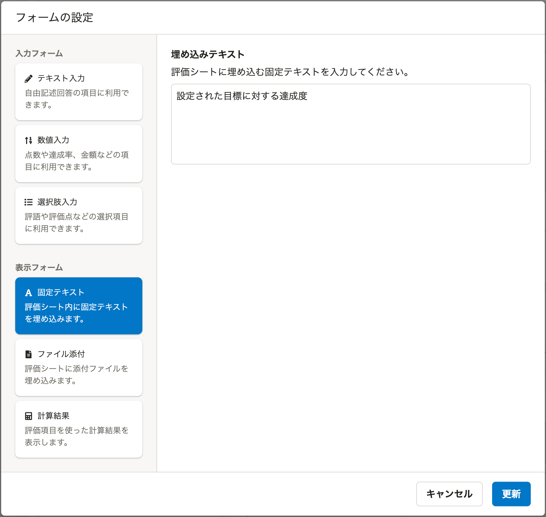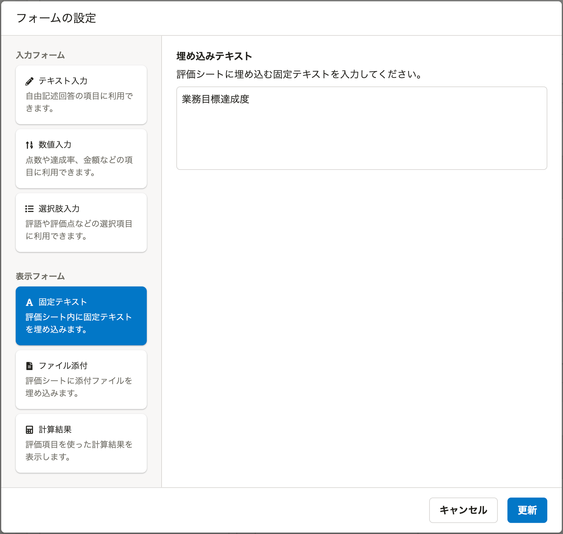 ウェイトは計算結果フォームや選択肢入力フォーム、数値入力フォームで設定でき、このサンプルでは計算結果フォームで設定しています。計算結果フォームを使う場合、評価シート編集画面では設定した数値が表示されないことに注意してください。また、従業員が評価シートを開いた際も、一度入力内容を[更新]しないとウェイトの数値が表示されません。
