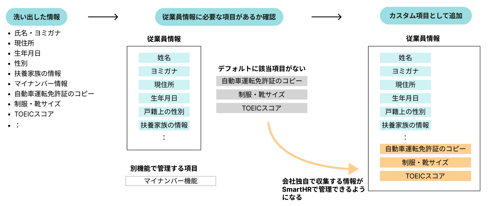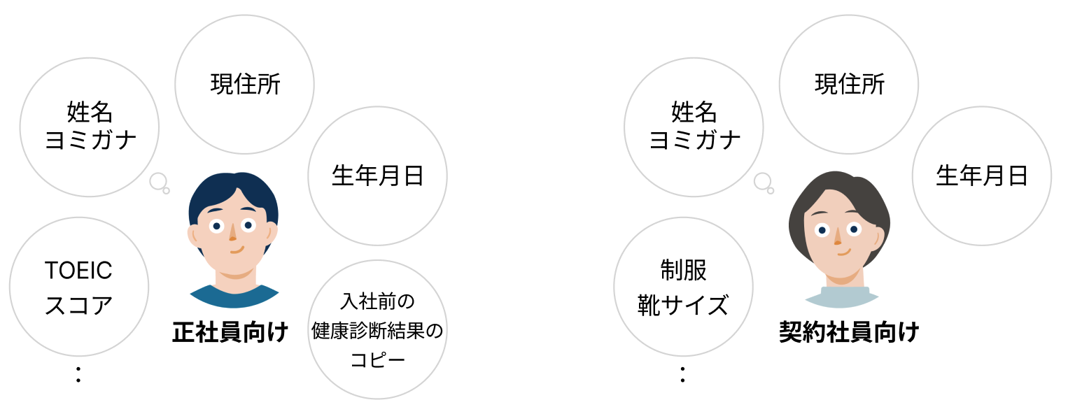 従業員から収集する情報が、SmartHRの従業員情報にあらかじめ用意されている項目(システム標準項目)にない場合は、会社独自の情報を管理するための項目(カスタム項目)を追加します。