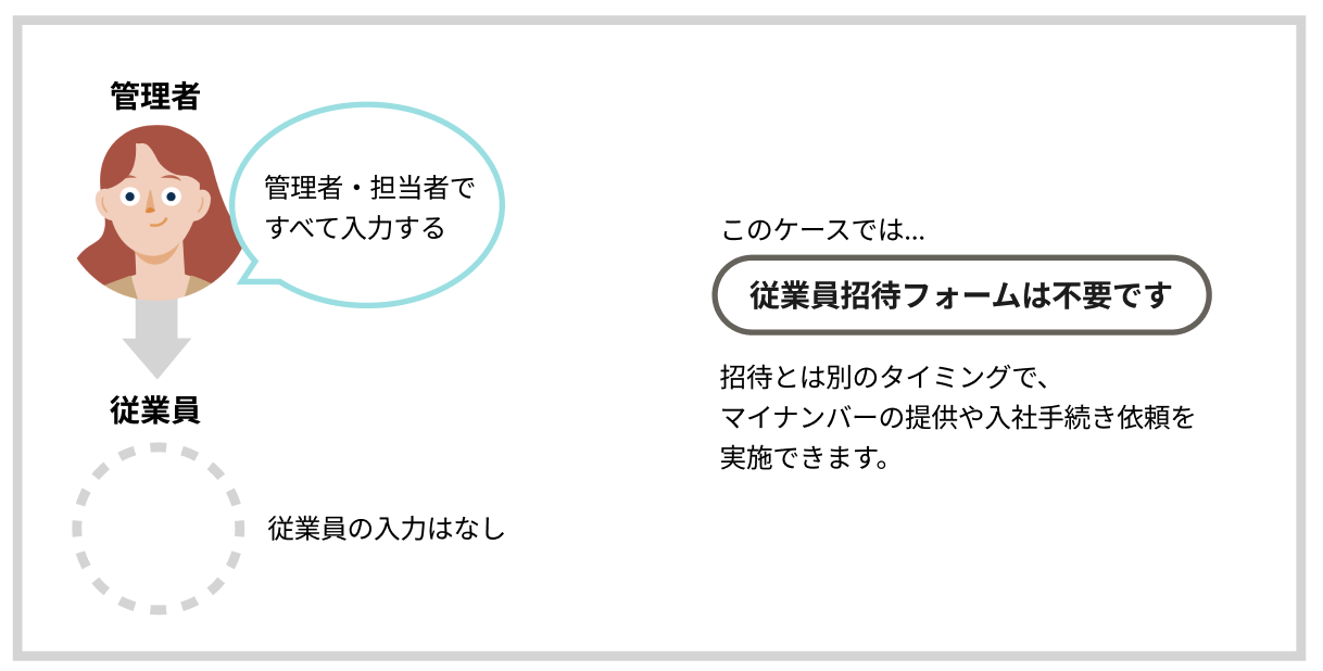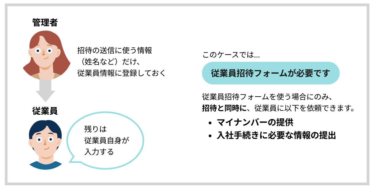 従業員から収集する情報を誰がSmartHRに入力するかによって、従業員招待フォームの準備が必要かどうかが変わります。