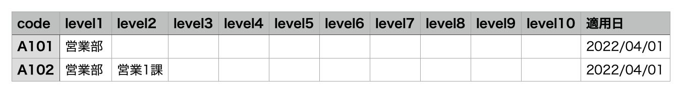 部署に階層がある場合、上位から順にlevel1、level2、level3…の列に入力します。 下位部署を入力する際も、上位部署名をすべて入力する必要があります。下図のように、階段状に入力します。