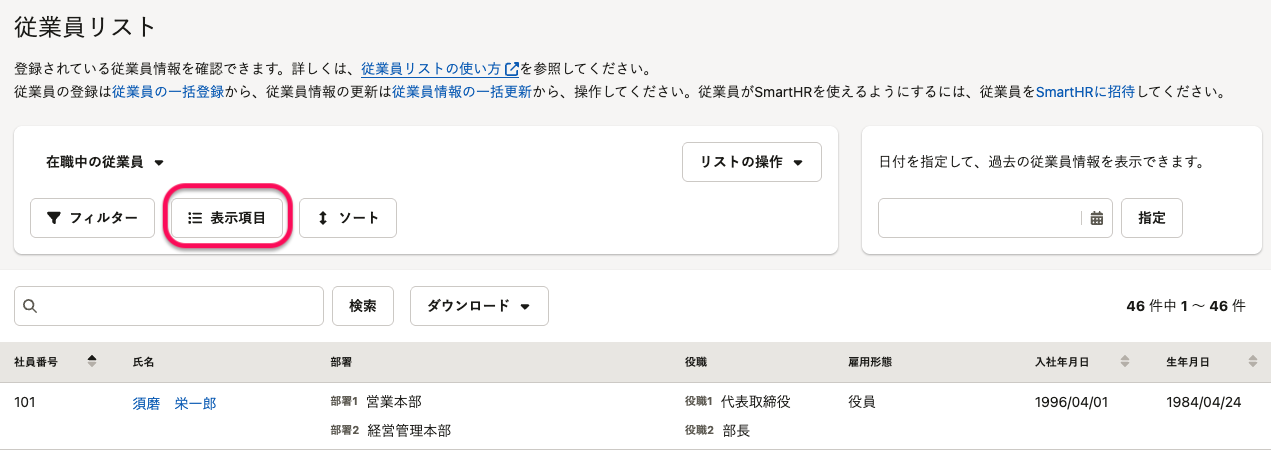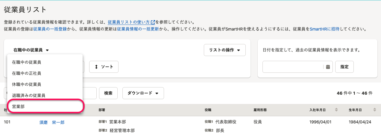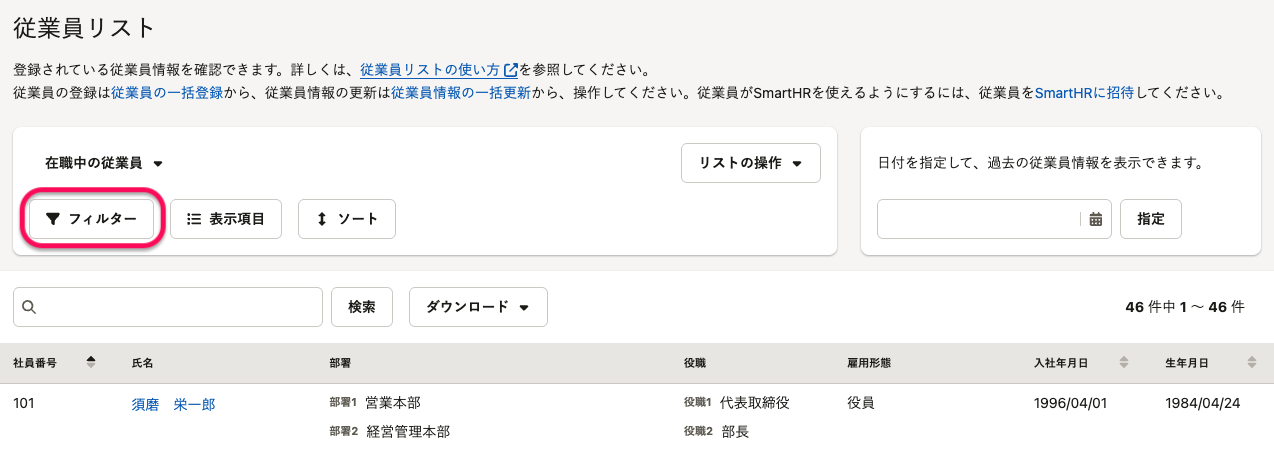 [従業員リスト]で、条件を設定して従業員を絞り込んで表示したり、項目を選んで従業員情報をダウンロードしたりする方法を説明します。