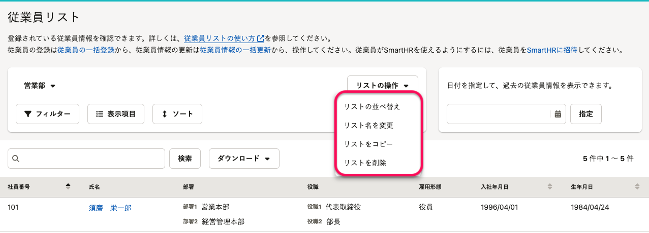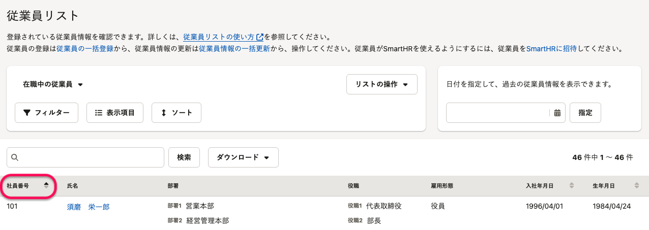 また、一覧のヘッダー(社員番号や、入社年月日などの日付に関連する項目)を押すと、昇順と降順を切り替えられます。