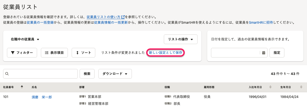 従業員検索画面にて、自由にフィルターを設定して従業員の絞り込みや表示項目の設定ができ、適用された条件をカスタムリストとして保存できます。