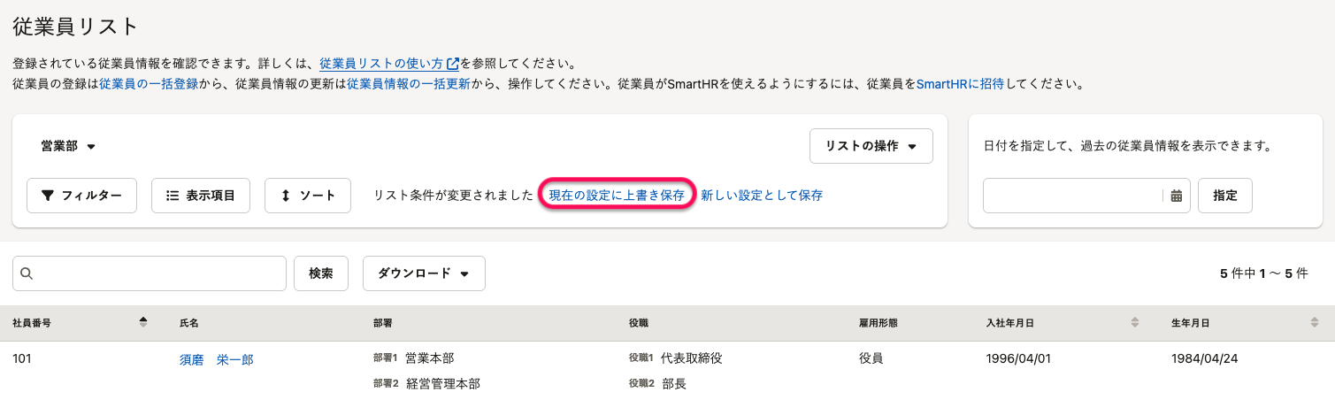改めてフィルターや表示項目を設定して[現在の設定に上書き保存]を押すと、リストの条件を上書きできます。