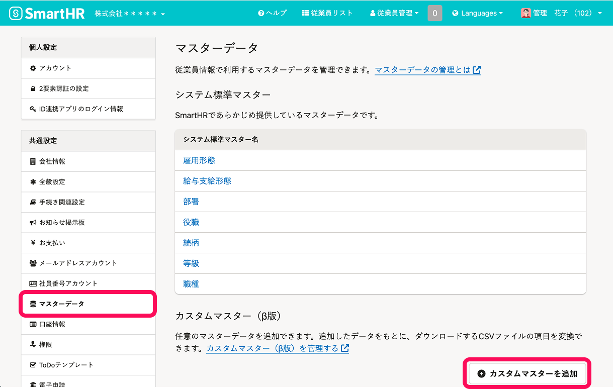 コードに変換したい従業員情報・家族情報を、カスタムマスターに登録します。 ホームにあるアプリ一覧の[共通設定]> [マスターデータ] を押すと、マスターデータ画面が表示されます。