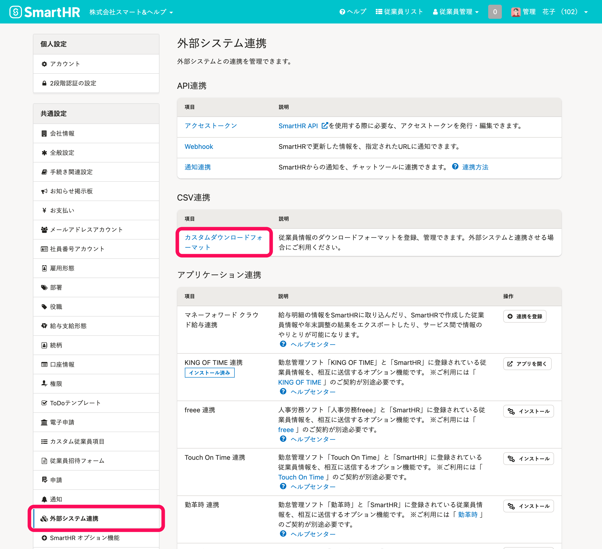 ホームにあるアプリ一覧の[共通設定]>[外部システム連携]>[カスタムダウンロードフォーマット]を押すと、カスタムダウンロードフォーマット画面が表示されます。