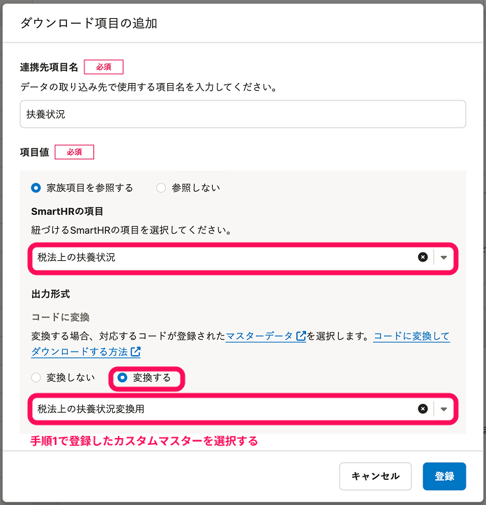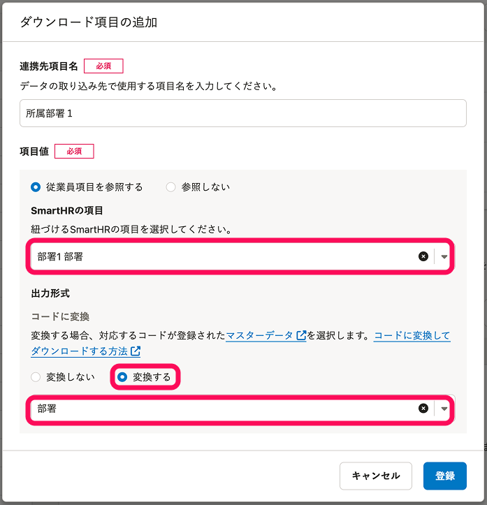 ダウンロード項目の追加画面の[SmartHRの項目]で、コードに変換したい項目を選択します。 [出力形式]の[コードに変換]で[変換する]を指定し、手順1で登録したマスターデータを選択して、[登録]を押します。