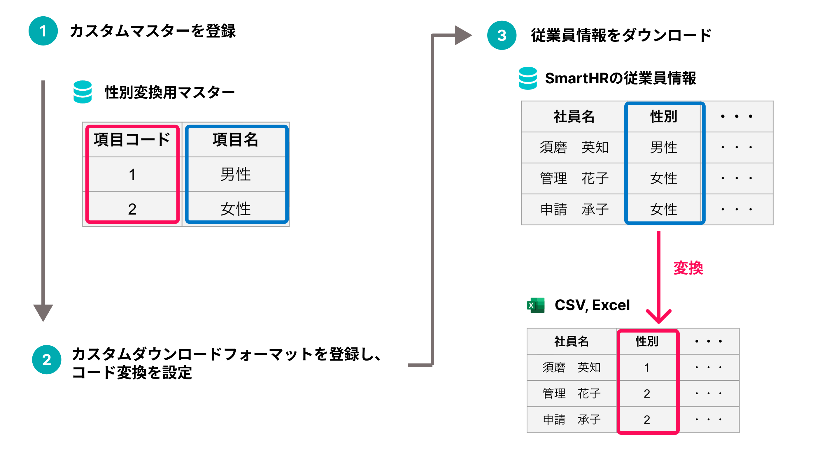「カスタムマスター」にコード変換用のデータを登録し、「カスタムダウンロードフォーマット」でコード変換を設定すると、SmartHRの従業員情報をコードに変換してダウンロードできます。