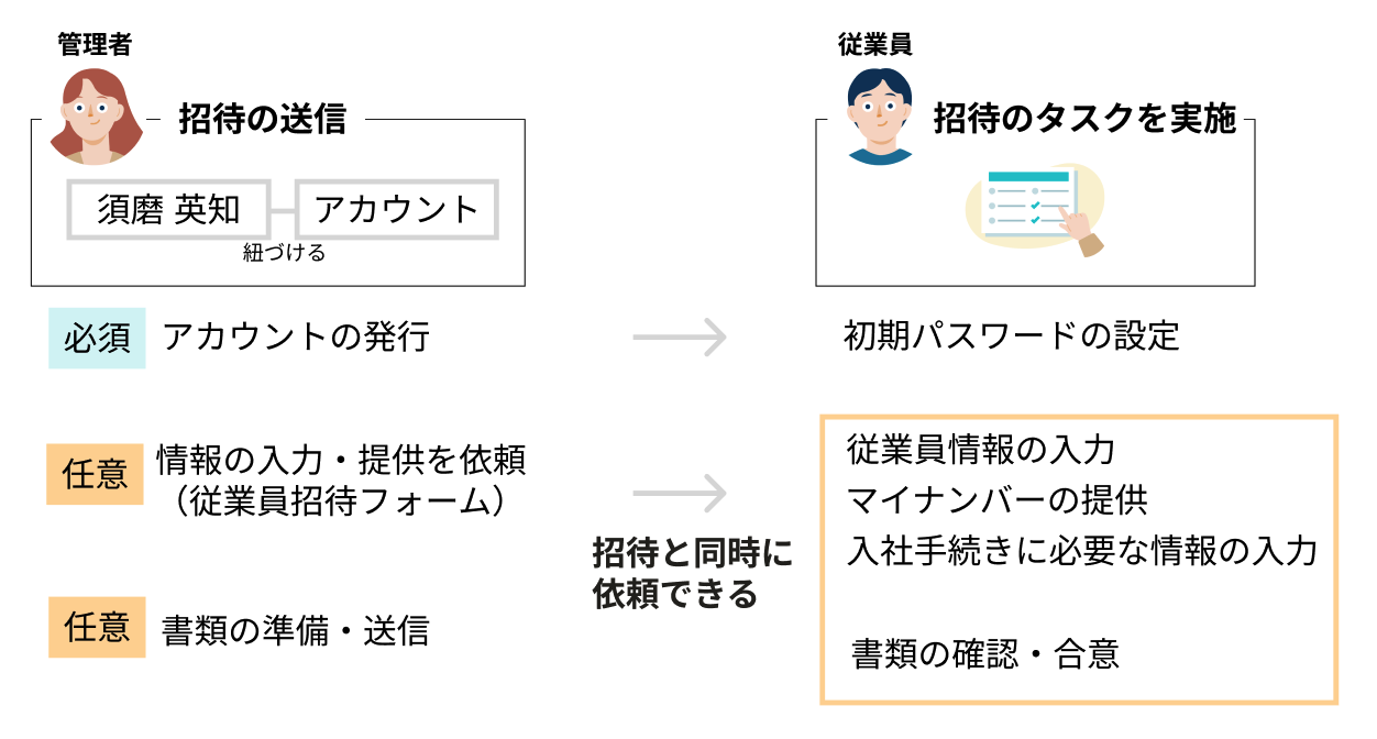 管理者が従業員情報を登録するだけではアカウントは発行されず、従業員はSmartHRにログインができません。 「従業員情報」と「アカウント」は、それぞれ別の仕組みとして存在するため、招待の作業で両者を紐づける必要があります。