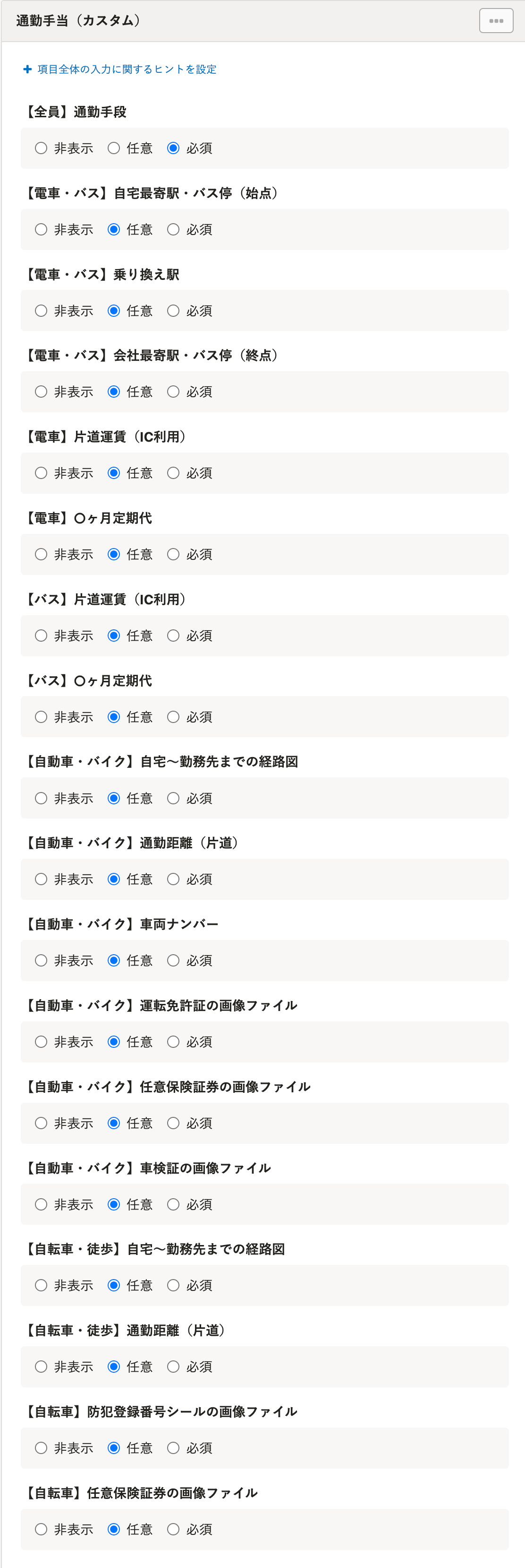 事前に準備した[通勤手当(カスタム)]の各項目の入力を、必須にするか指定します。