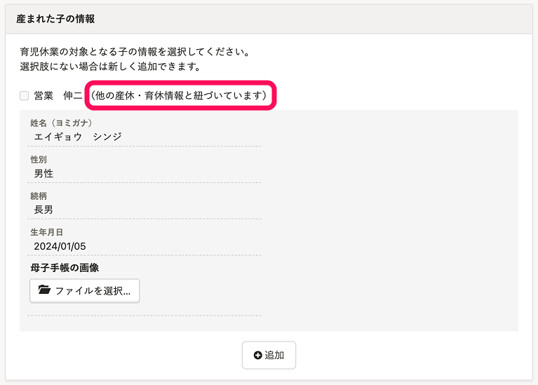 Q. 「(他の産休・育休情報と紐づいています)」と表示されて子の情報を選択できない場合の育児休業給付金申請の対応方法
