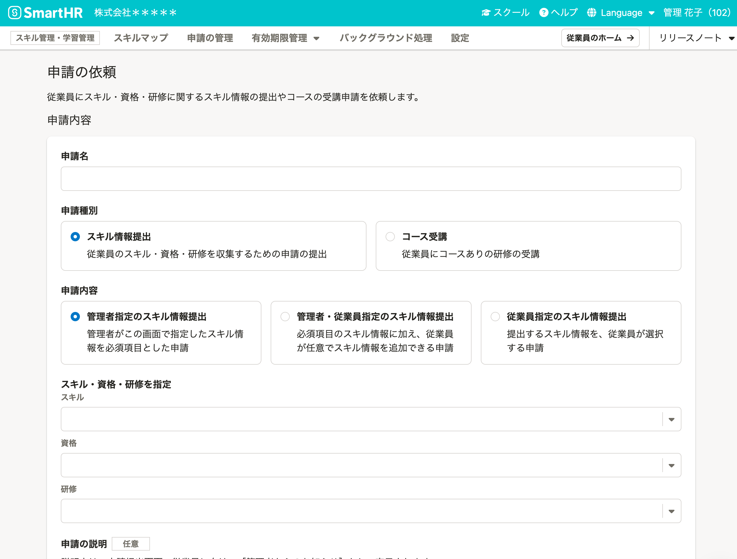 - 申請内容:「管理者指定」を選択し、任意のスキル・資格・研修を指定。