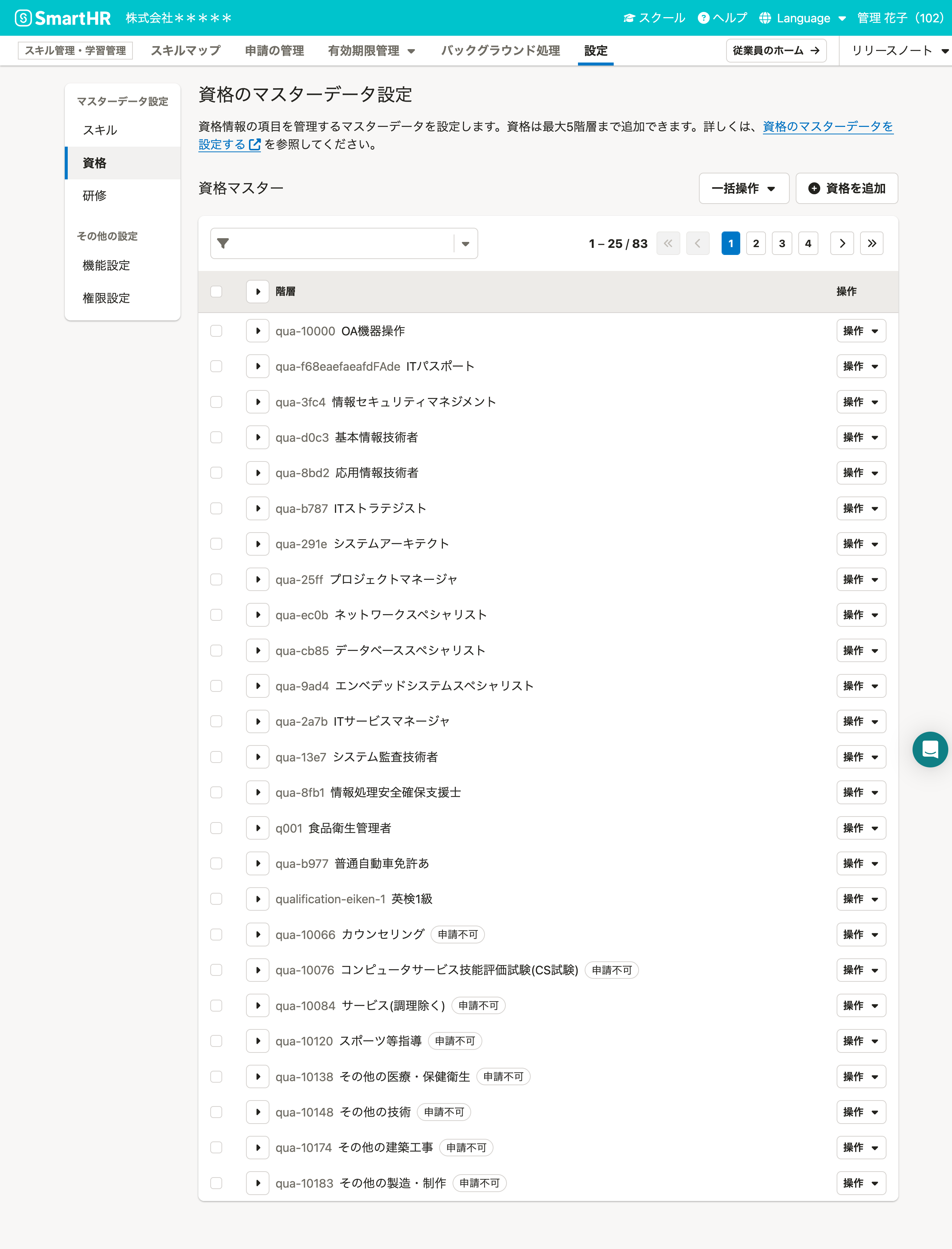 スキル管理機能で扱えるのは、機能管理者が設定済みのスキル・資格・研修だけです。どのようなスキル・資格・研修が登録されているかを確認しておきましょう。