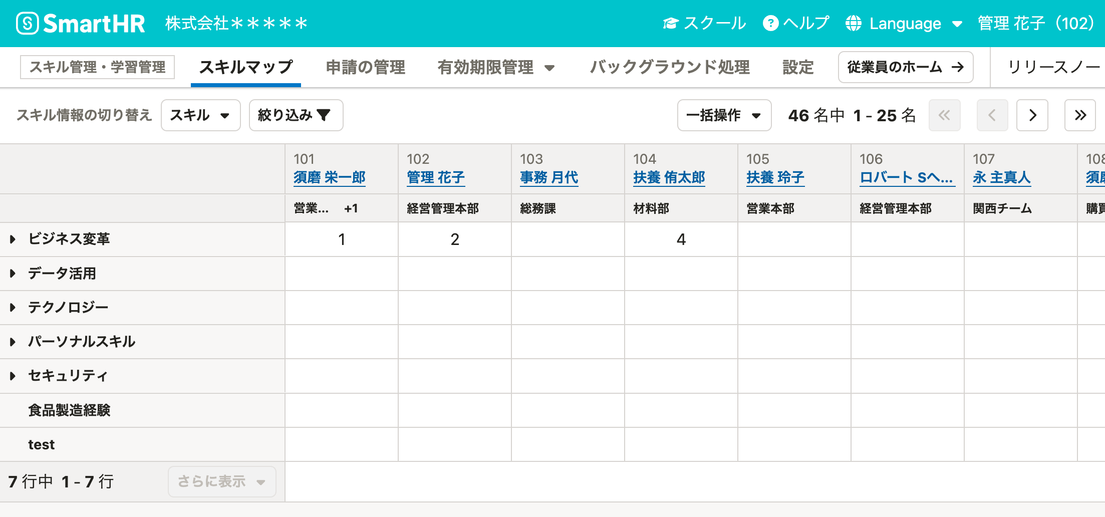 - [スキルマップ]:従業員のスキル情報を一覧で閲覧できる画面