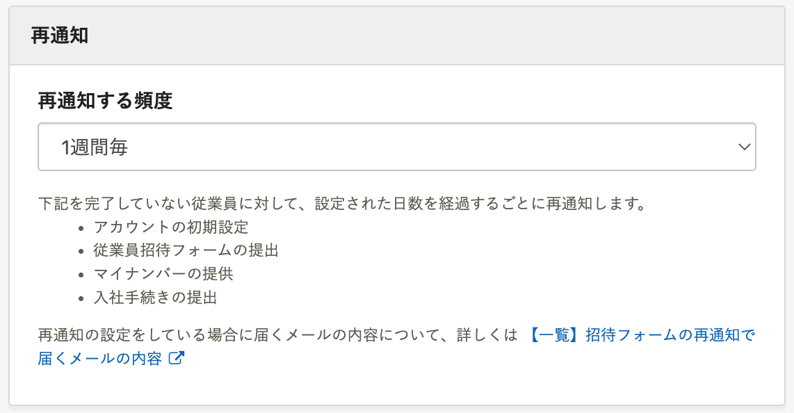 招待メールの再通知頻度を変更すると、招待した日を起点に、変更後の頻度で招待メールが送信されます。 再通知頻度の変更後に招待を送信された従業員も、新しい通知頻度で通知されます。